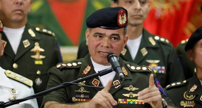 أعلن وزير الدفاع الفنزويلي، فلاديمير بادرينو، أن جيش بلاده لن يعترف بإعلان رئيس البرلمان المعارض خوان جوايدو نفسه رئيسا للبلاد. وكتب بادرينو، عبر حسابه على موقع “تويتر”، يقول “جنود الوطن لا يقبلون برئيس مفروض في ظل مصالح غامضة أو أعلن نفسه رئيساً بطريقة غير قانونية”، وأضاف بادرينو أن القوات المسلحة الفنزويلية “تدافع عن دستورنا وتضمن السيادة الوطنية”.